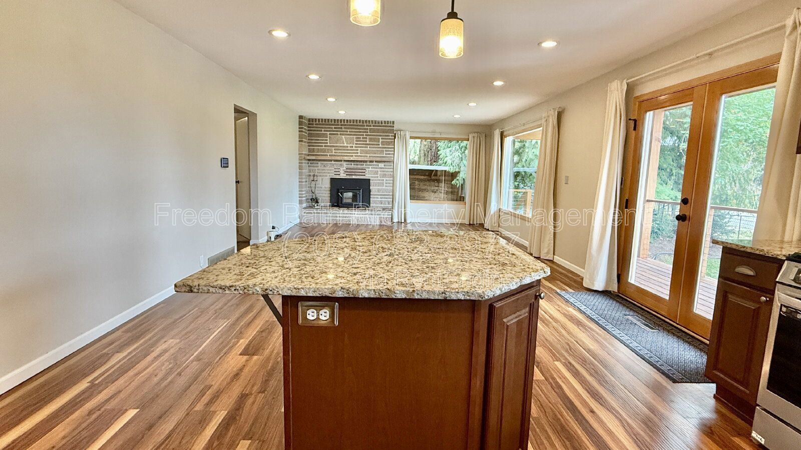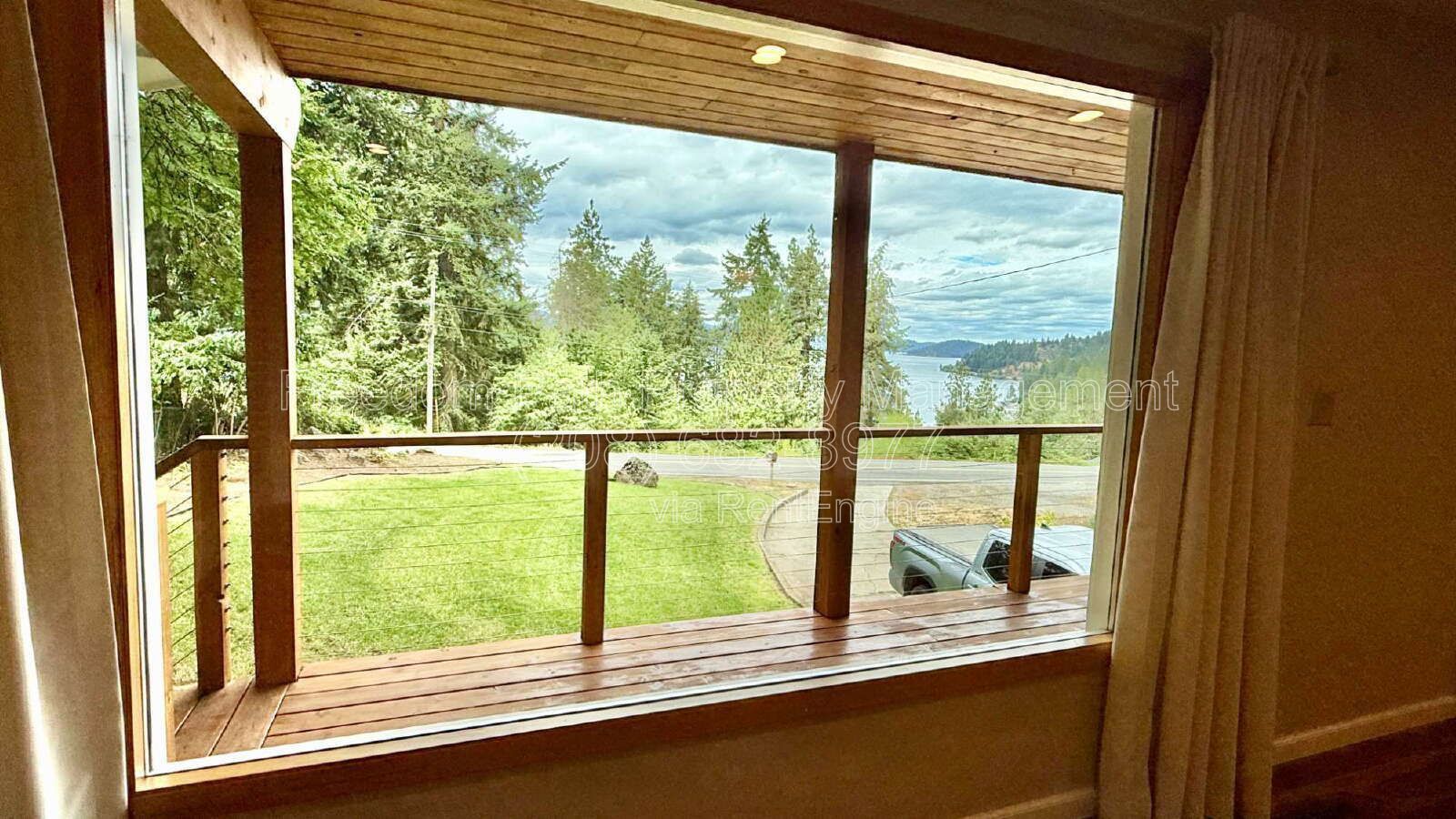Enjoy elevated North Idaho living in this beautifully refined lakeview home offering a 2-bed/1-bath main residence plus a completely finished 1-bed/1-bath guest suite with its own kitchenette. Thoughtfully renovated throughout, this property blends rich natural finishes with upscale modern touches. The main living area features true hardwood flooring, recessed lighting, and oversized picture windows that frame captivating views of Lake Coeur d’Alene. A wood-burning fireplace with stacked-stone surround adds warmth and character. The gourmet kitchen is appointed with live-edge granite countertops, a large center island, stainless steel appliances, full tile backsplash and pendant lighting – all perfectly positioned to capture the lake view through the kitchen windows and French doors. The dining area sits just off the kitchen and enjoys wrap-around windows overlooking the water and backyard garden area. Step outside to a full-length cedar deck with cable railing for unobstructed views, perfect for relaxing or entertaining. The primary bedrooms are spacious and updated with natural light and new carpet. Downstairs, the guest suite includes luxury vinyl plank flooring, butcher-block kitchenette, modern fixtures and a stylish full bathroom – ideal for guests, in-laws or extended stays. Additional amenities include a separate laundry room with custom built-in shelving, fenced garden space, and private wooded surroundings. Located minutes to the lake and only a quick drive back into town, this home offers both convenience and a true elevated retreat.
