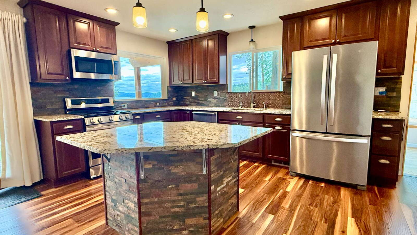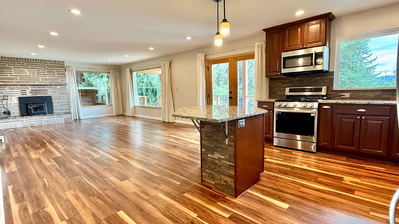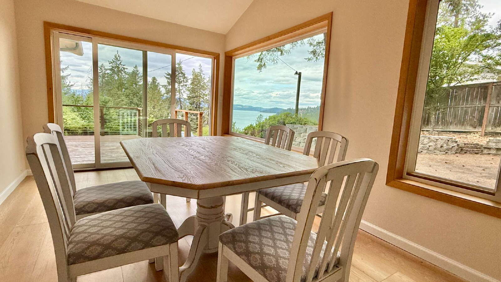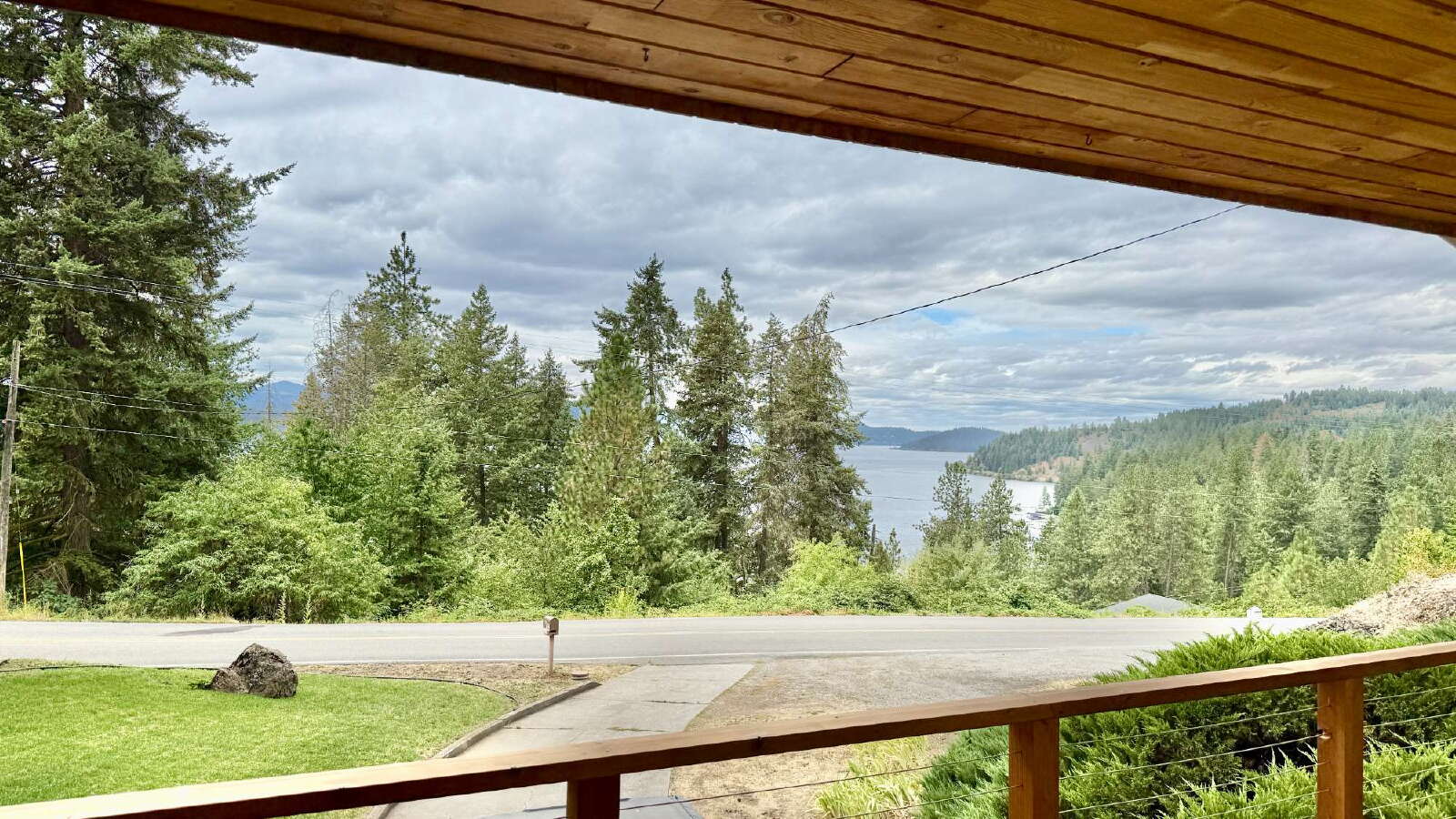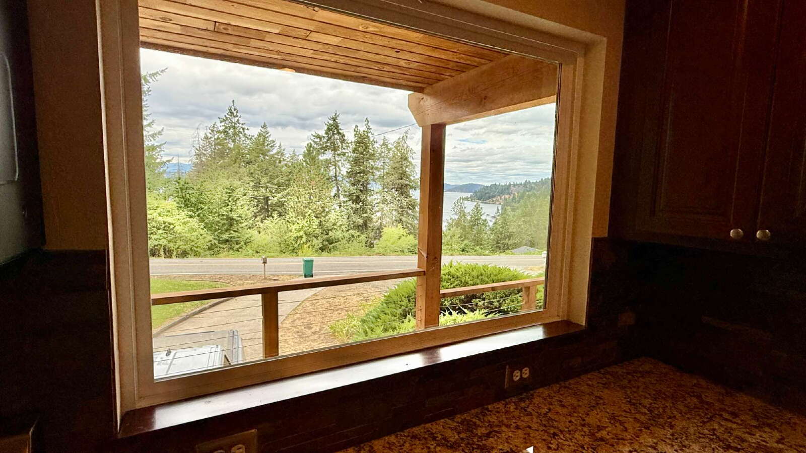 Enjoy elevated North Idaho living in this beautifully refined lakeview home offering a 2-bed/1-bath main residence plus a completely finished 1-bed/1-bath guest suite with its own kitchenette. Thoughtfully renovated throughout, this property blends rich natural finishes with upscale modern touches. The main living area features true hardwood flooring, recessed lighting, and oversized picture windows that frame captivating views of Lake Coeur d’Alene. A wood-burning fireplace with stacked-stone surround adds warmth and character. The gourmet kitchen is appointed with live-edge granite countertops, a large center island, stainless steel appliances, full tile backsplash and pendant lighting – all perfectly positioned to capture the lake view through the kitchen windows and French doors. The dining area sits just off the kitchen and enjoys wrap-around windows overlooking the water and backyard garden area. Step outside to a full-length cedar deck with cable railing for unobstructed views, perfect for relaxing or entertaining. The primary bedrooms are spacious and updated with natural light and new carpet. Downstairs, the guest suite includes luxury vinyl plank flooring, butcher-block kitchenette, modern fixtures and a stylish full bathroom – ideal for guests, in-laws or extended stays. Additional amenities include a separate laundry room with custom built-in shelving, fenced garden space, and private wooded surroundings. Located minutes to the lake and only a quick drive back into town, this home offers both convenience and a true elevated retreat.
