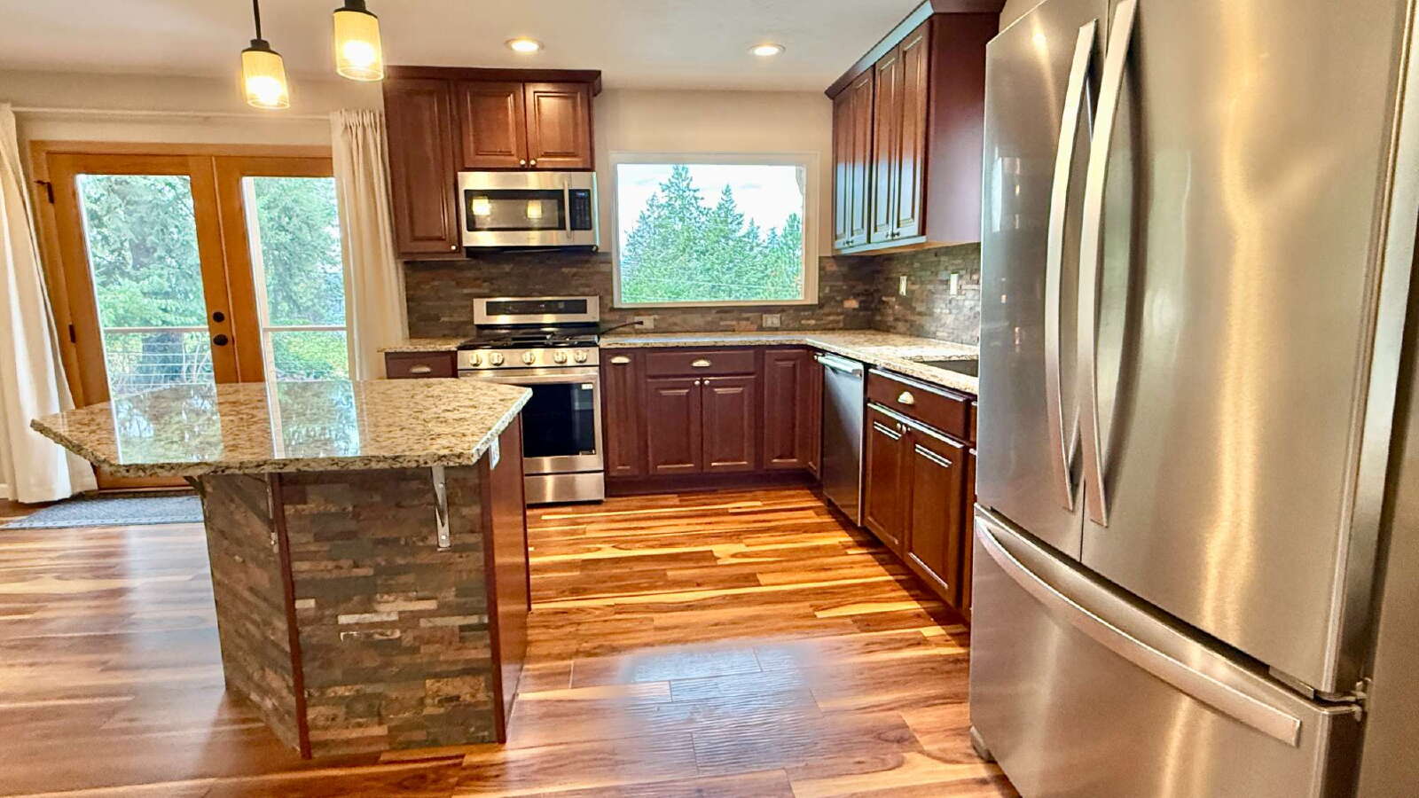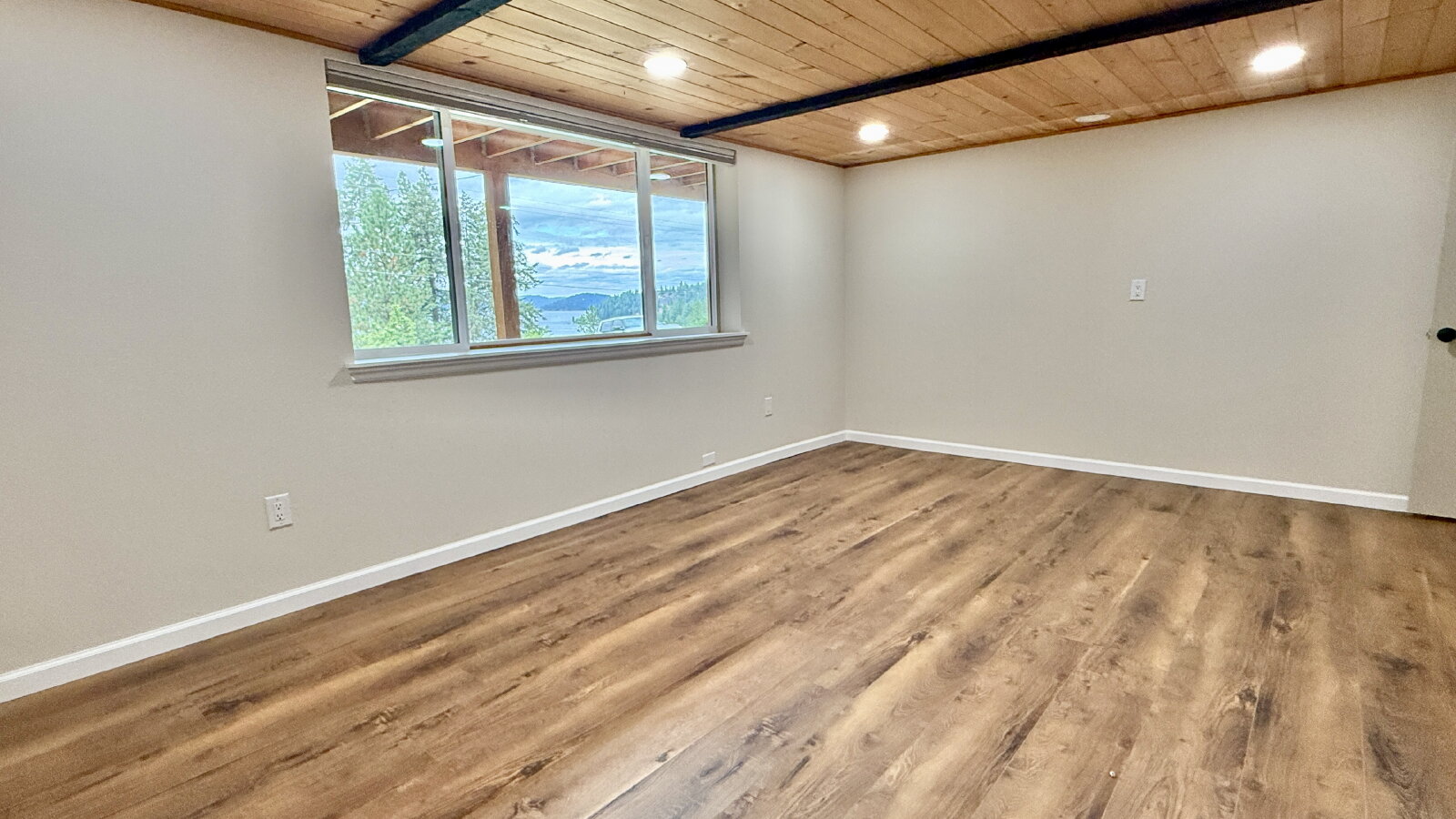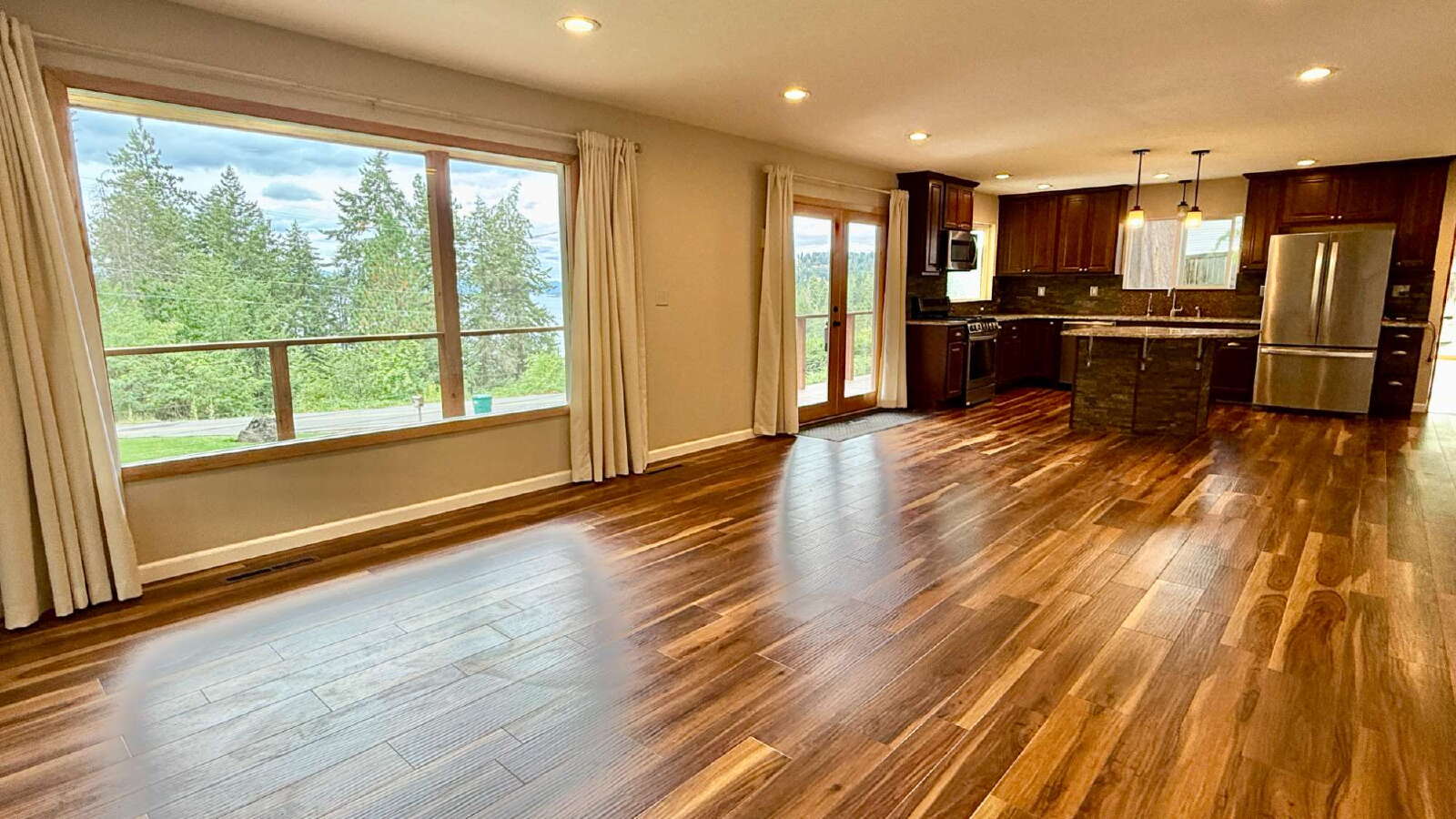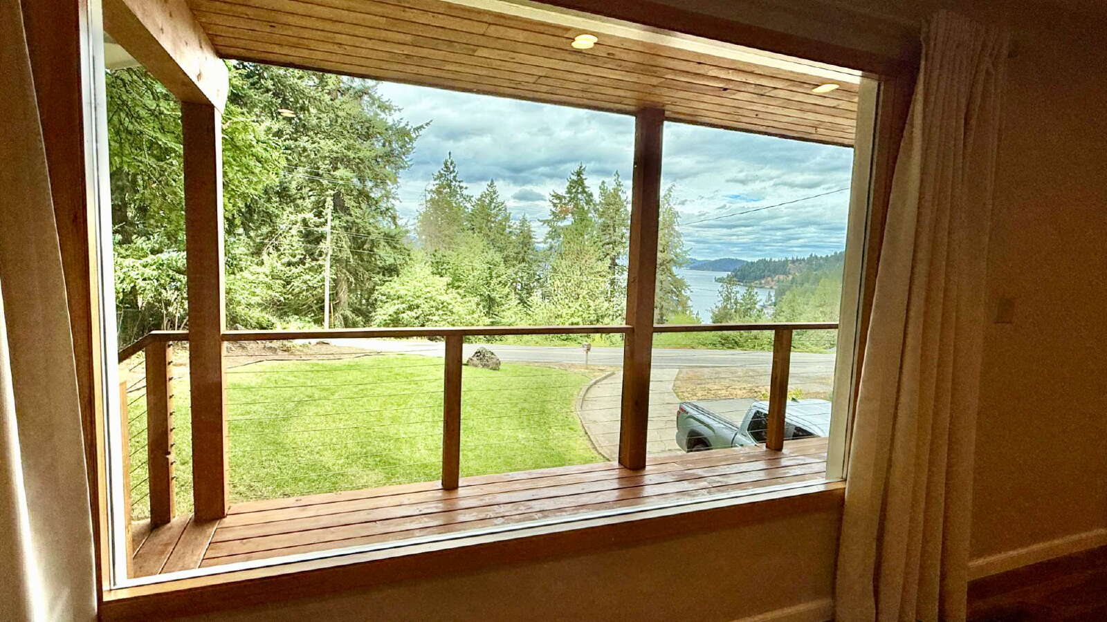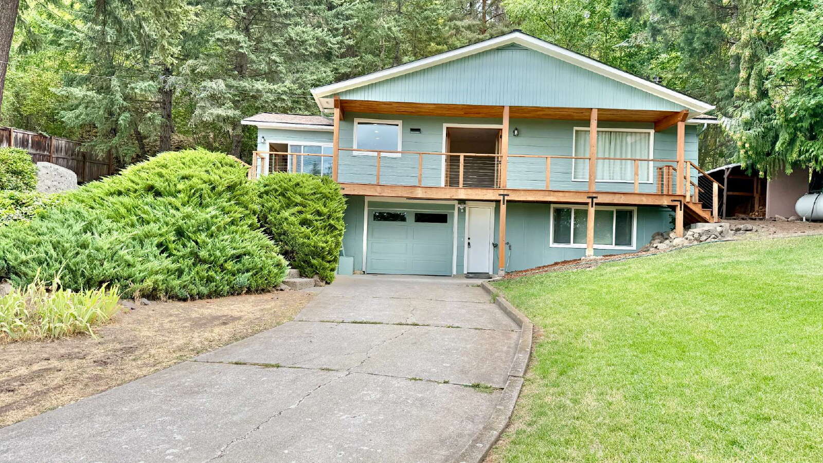 Enjoy elevated North Idaho living in this beautifully refined lakeview home offering a 2-bed/1-bath main residence plus a completely finished 1-bed/1-bath guest suite with its own kitchenette. Thoughtfully renovated throughout, this property blends rich natural finishes with upscale modern touches. The main living area features true hardwood flooring, recessed lighting, and oversized picture windows that frame captivating views of Lake Coeur d’Alene. A wood-burning fireplace with stacked-stone surround adds warmth and character. The gourmet kitchen is appointed with live-edge granite countertops, a large center island, stainless steel appliances, full tile backsplash and pendant lighting – all perfectly positioned to capture the lake view through the kitchen windows and French doors. The dining area sits just off the kitchen and enjoys wrap-around windows overlooking the water and backyard garden area. Step outside to a full-length cedar deck with cable railing for unobstructed views, perfect for relaxing or entertaining. The primary bedrooms are spacious and updated with natural light and new carpet. Downstairs, the guest suite includes luxury vinyl plank flooring, butcher-block kitchenette, modern fixtures and a stylish full bathroom – ideal for guests, in-laws or extended stays. Additional amenities include a separate laundry room with custom built-in shelving, fenced garden space, and private wooded surroundings. Located minutes to the lake and only a quick drive back into town, this home offers both convenience and a true elevated retreat.