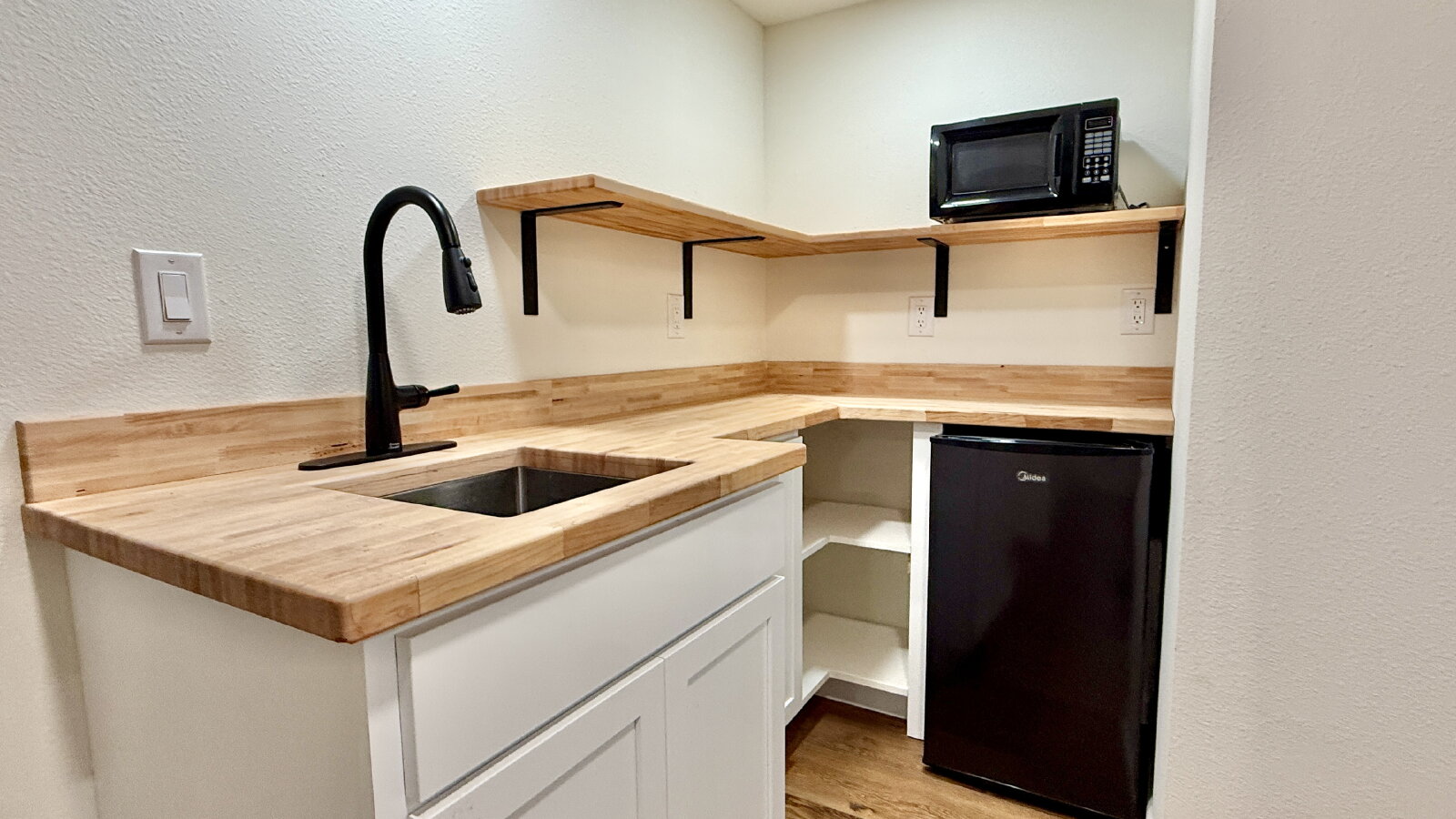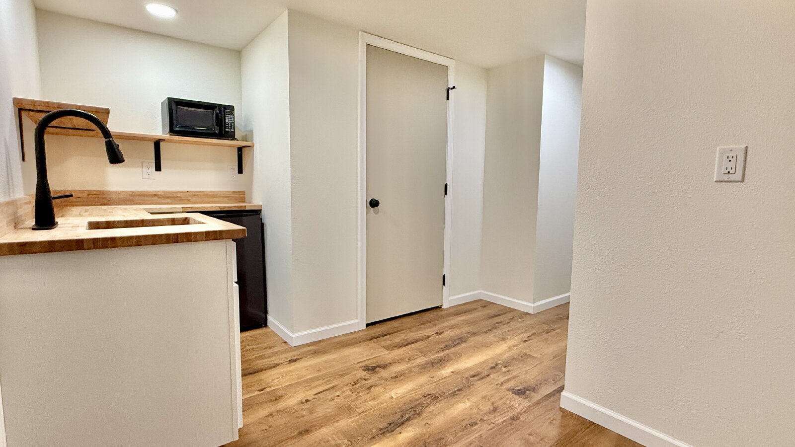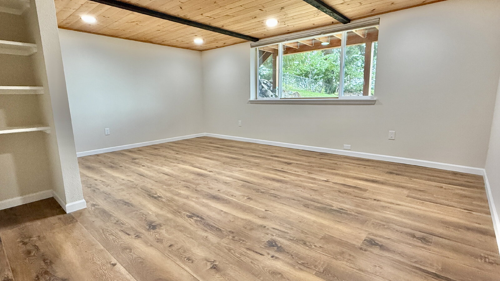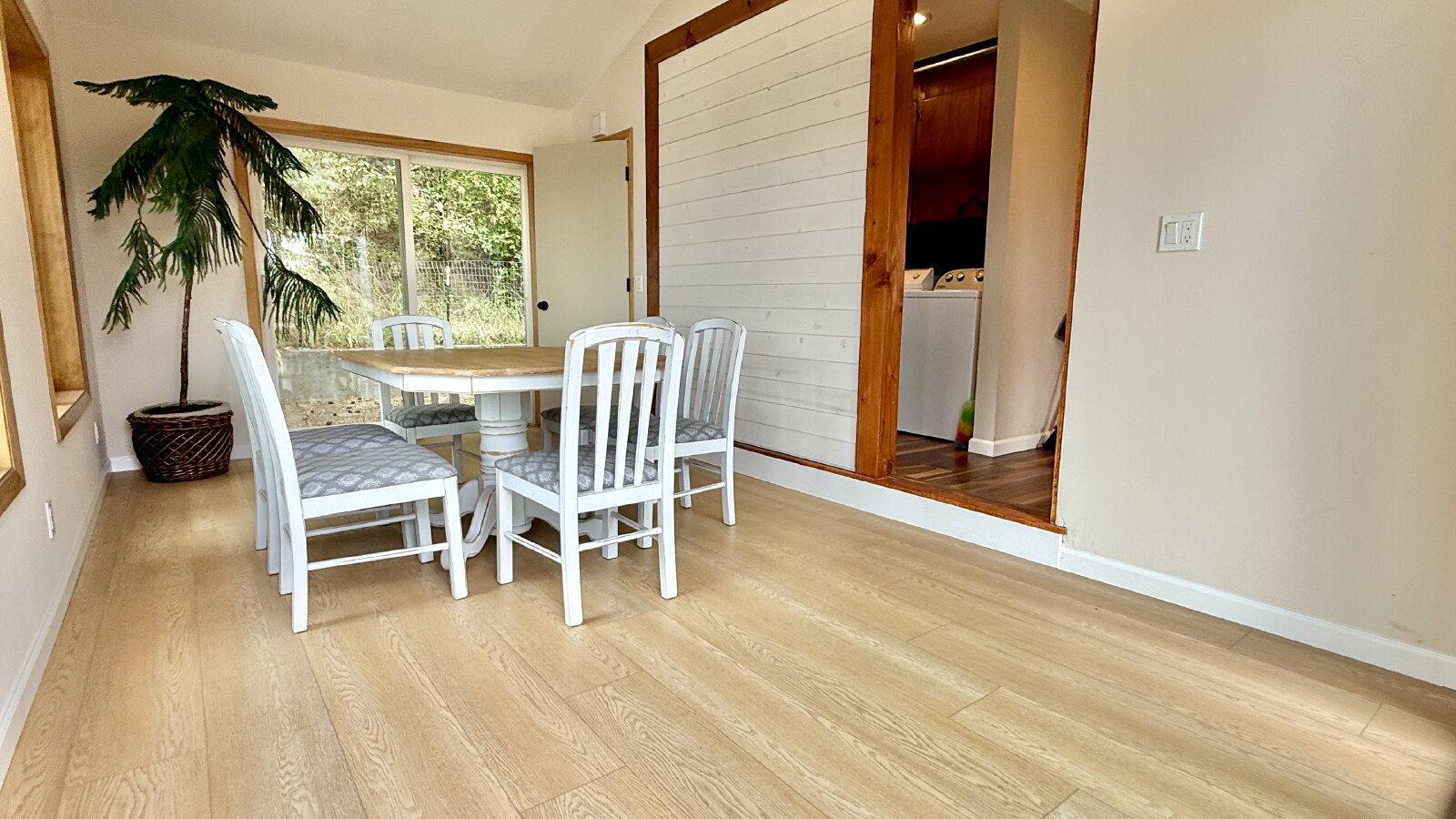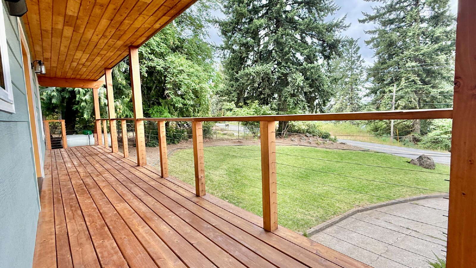 Enjoy elevated North Idaho living in this beautifully refined lakeview home offering a 2-bed/1-bath main residence plus a completely finished 1-bed/1-bath guest suite with its own kitchenette. Thoughtfully renovated throughout, this property blends rich natural finishes with upscale modern touches. The main living area features true hardwood flooring, recessed lighting, and oversized picture windows that frame captivating views of Lake Coeur d’Alene. A wood-burning fireplace with stacked-stone surround adds warmth and character. The gourmet kitchen is appointed with live-edge granite countertops, a large center island, stainless steel appliances, full tile backsplash and pendant lighting – all perfectly positioned to capture the lake view through the kitchen windows and French doors. The dining area sits just off the kitchen and enjoys wrap-around windows overlooking the water and backyard garden area. Step outside to a full-length cedar deck with cable railing for unobstructed views, perfect for relaxing or entertaining. The primary bedrooms are spacious and updated with natural light and new carpet. Downstairs, the guest suite includes luxury vinyl plank flooring, butcher-block kitchenette, modern fixtures and a stylish full bathroom – ideal for guests, in-laws or extended stays. Additional amenities include a separate laundry room with custom built-in shelving, fenced garden space, and private wooded surroundings. Located minutes to the lake and only a quick drive back into town, this home offers both convenience and a true elevated retreat.
